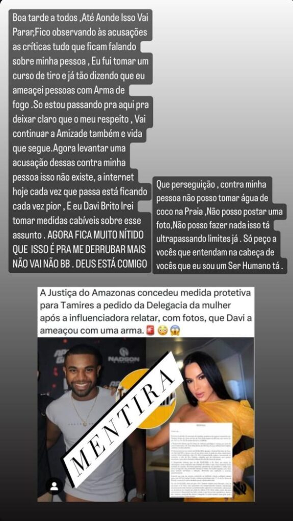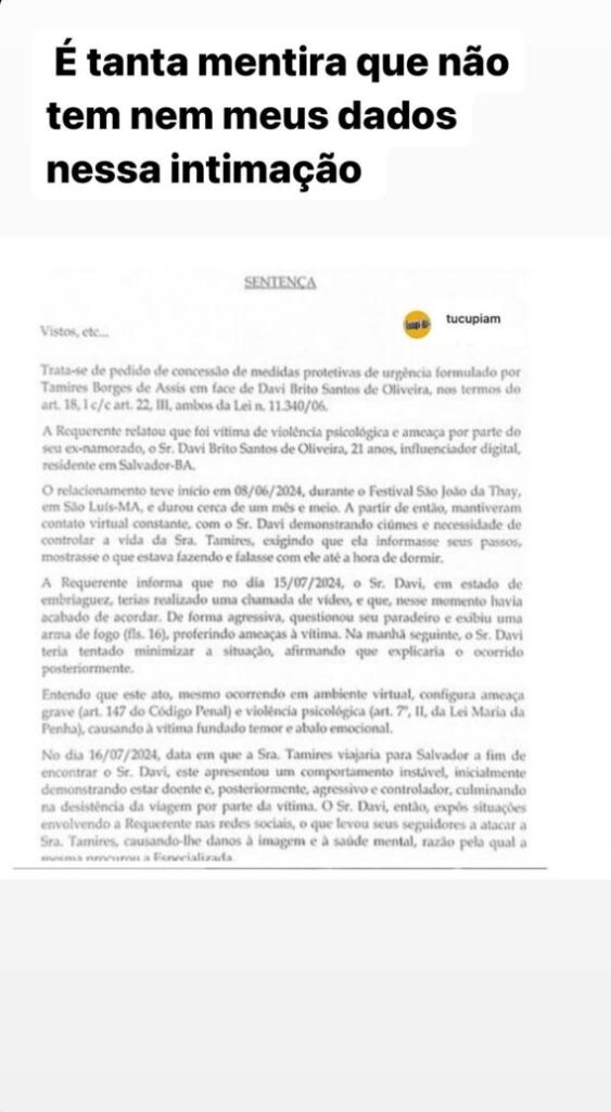 Esse pedido da influencer foi feito pela Delegacia Especializada em Crimes Contra a Mulher (DECCM) do Amazonas. Davi não pode citar seu nome, entrar em contato com ela nas redes sociais, e não pode ficar a menos de 100 metros da onde Tamires esteja. Segundo reportagem do F5, a Polícia Civil do Amazonas confirmou o caso.
