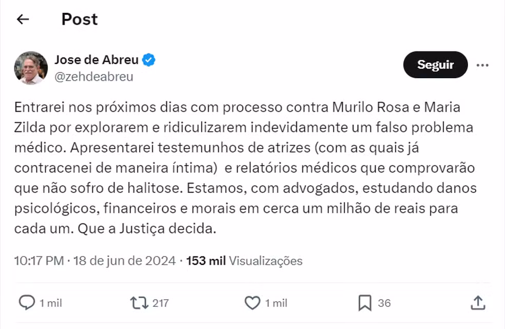 “Entrarei nos próximos dias com processo contra Murilo Rosa e Maria Zilda por explorarem e ridicularizaram indevidamente um falso problema médico. Apresentarei testemunhos de atrizes, com as quais já contracenei de maneira íntima, e relatórios médicos que comprovarão que não sofro de halitose. Estamos, com advogados, estudando danos psicológicos, financeiros e morais em cerca um milhão de reais para cada um. Que a Justiça decida”, publicou o ator.