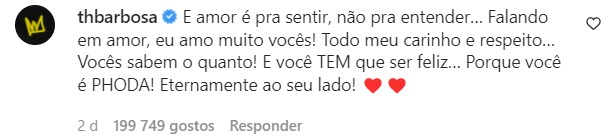 Tata Werneck, Sandy, Bruno de Luca e diversos outros famosos deixaram comentários para o casal, mas o que chamou a atenção foi o comentário de Thiaguinho. O cantor mais uma vez demonstrou ser um fofo e cheio de maturidade.