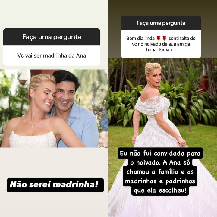 Quando indagada se seria madrinha do casamento, Ticiane confirmou: “Não serei madrinha”, acompanhando a resposta com uma foto dos noivos.