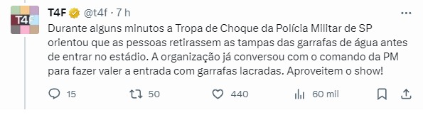 “Durante alguns minutos a Tropa de Choque da Polícia Militar de SP orientou que as pessoas retirassem as tampas das garrafas de água antes de entrar no estádio. A organização já conversou com o comando da PM para fazer valer a entrada com garrafas lacradas. Aproveitem o show!”, declarou a Time For Fun.