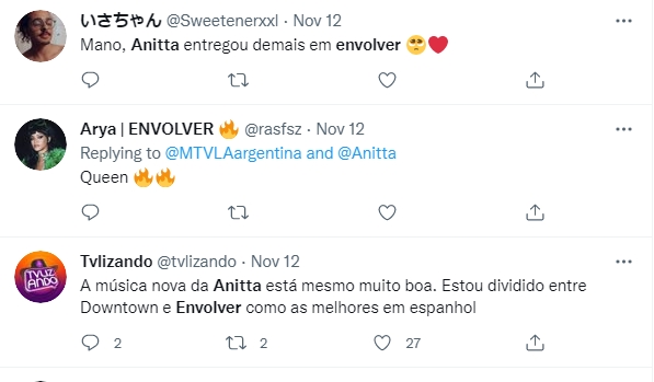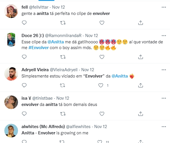 Bastou Anitta lançar seu clipe dançante e sensual que o Twitter veio abaixo. Muitos comentários positivos, pois realmente, a música é ótima, super dançante. Alguns seguidores disseram estar viciados em “Envolver”. Um seguidor postou: “Mano, Anitta entregou demais em Envolver”. Já outro disse: “Esse clipe da Anitta me dá gatilho, ai que vontade de me envolver com o boy assim mds”. Só se fala nisso!
