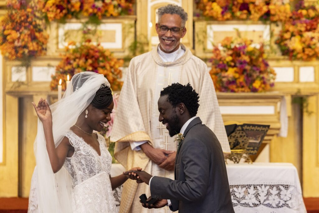 Durante a cerimônia, o padre fala sobre amor e compromisso, e o clima de ternura toma conta do local quando os noivos trocam votos e alianças sob aplausos calorosos. A festa segue animada na vila, com muita alegria e celebração.