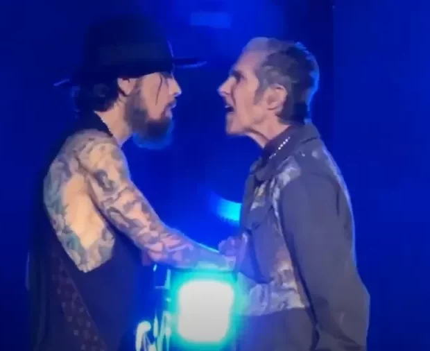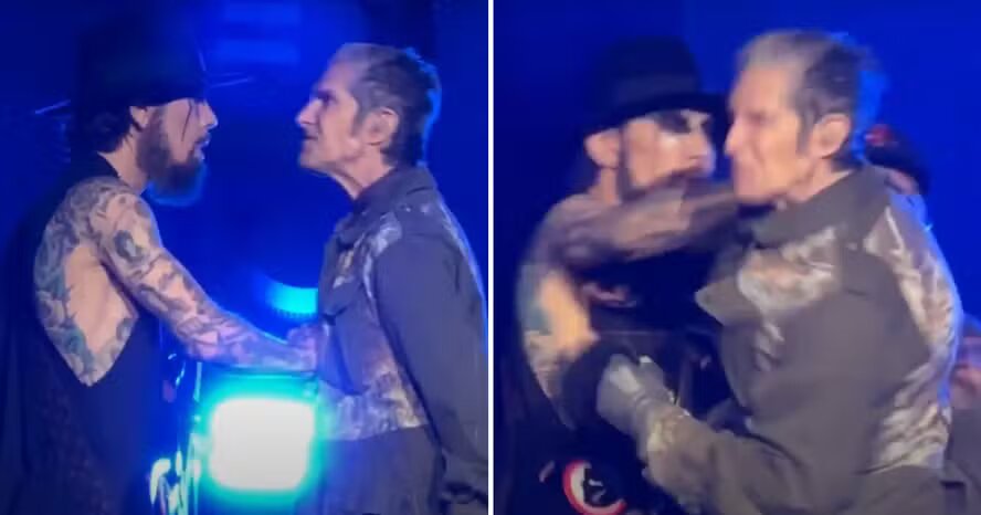Parece que o vocalista da vocalista do Jane’s Addiction, Perry Farrell acabou se estranhando com Dave Navarro, guitarrista da banda, durante o show desta sexta-feira (13). Essa tensão de Farrell resultou numa agressão física contra Navarro e paralisação da música enquanto a equipe continha o cantor no palco.