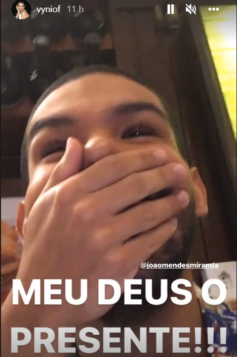 Na noite de ontem (30), Vyni foi surpreendido por uma surpresa de João, que o presenteou com um iPhone 13. O ex-BBB foi a loucura, e deixou sua surpresa evidente nos stories. “Minha gente, eu não sei o que falar não, deixa eu até botar em cima do prato, porque eu não to dando bola para mais nada não, não posso gritar porque tô em restaurante chique, tô me tremendo, olha o presente”, disse, mostrando o celular novo.