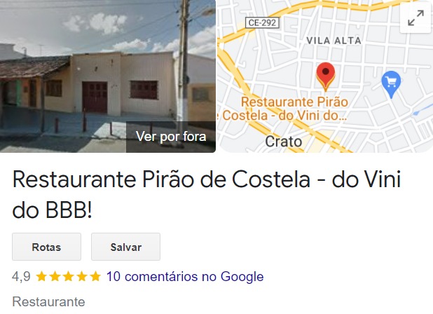 O restaurante é localizado na cidade de Crato, no Ceará, e pela localização do Google Maps dá para ver que a fama vem do garoto mesmo, pois o nome foi alterado para ‘Restaurante Pirão de Costela – do Vini do BBB’.