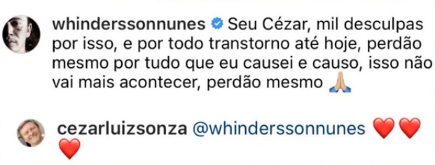 Cézar respondeu com corações às declarações de Whind, que parece já ter feito bastante confusão na família Sonza. Será que são águas passadas?