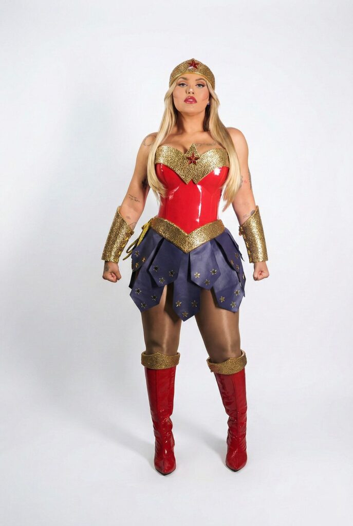 Yara Tchê assumiu o posto de diva cosplay com três personagens que dariam inveja a qualquer Comic Con com open bar. A Mulher-Gato apareceu em versão poderosa, com referência pop atualizada e uma cabeça estruturada em arame, coberta de renda e mais de mil cristais aplicados manualmente. Um trabalho que pede luz, lupa e nervo firme. Depois veio a Mulher-Maravilha em clima cartoon da DC, construída com técnicas de cosplay e cosmaker, toda dourada, toda cravejada, com cerca de cinco mil mini cristais reluzindo como se o palco fosse um painel de LED humano. Para fechar, a Arlequina surgiu fiel ao cinema, versão live action, figurino afiado e mais cinco mil cristais aplicados um a um, como quem borda um drama.