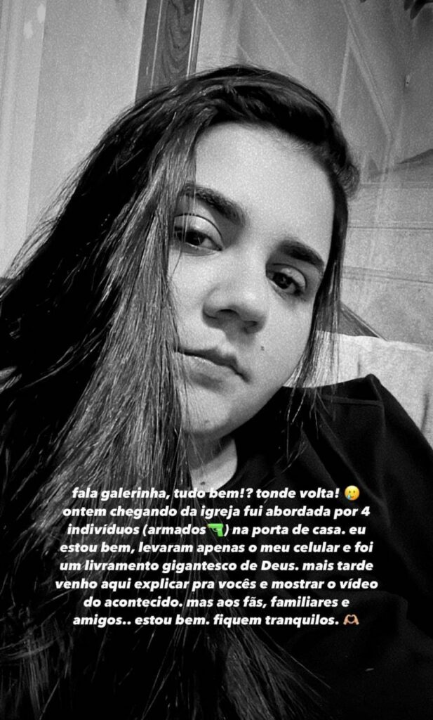 “Algo que eu não quero viver nunca mais na minha vida. Graças a Deus foi só o celular. Inclusive já comprei outro. Fica o trauma. Para dormir foi bem complicado nessa noite, crise de ansiedade. Eu estou bem. Não estamos dormindo em casa, a gente não tem nem coragem de voltar lá. Vamos ver até quando vamos ficar nessa aí”, finalizou a sertaneja.