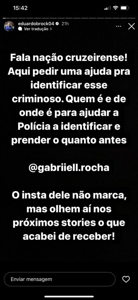 E onde foi parar a noção das pessoas, que esse criminoso pague por essas ameaças. Na noite de ontem, 21, o zagueiro do Cruzeiro, Eduardo Brock, publicou em seus stories no Instagram ameaças que recebeu de um torcedor: “Fala nação cruzeirense! Aqui pedir uma ajuda pra identificar esse criminoso. Quem é e de onde é para ajudar a Polícia a identificar e prender o quanto antes”, escreveu ele.