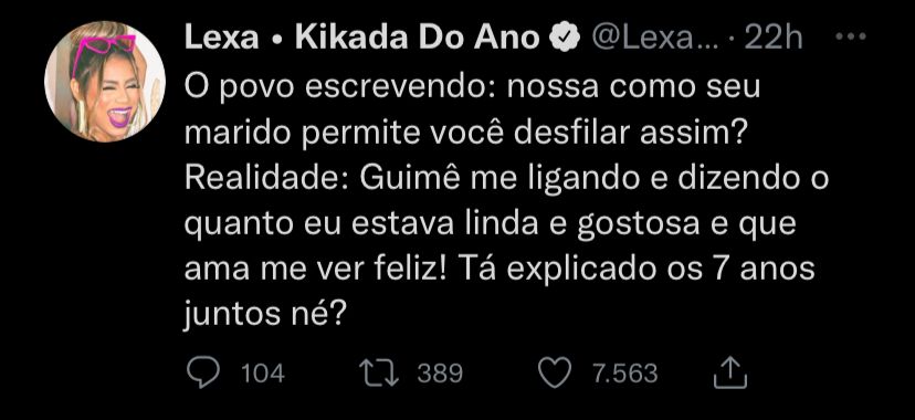 Lexa não ficou quieta e resolveu mandar o papo reto para os haters. “O povo escrevendo: nossa como seu marido permite você desfilar assim? Realidade: Guimê me ligando e dizendo o quanto eu estava linda e gostosa e que ama me ver feliz!”, escreveu a cantora, que é casada com o músico desde 2018.