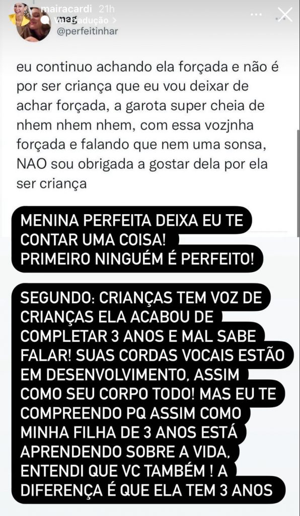 Maíra Cardi rebateu o comentário por meio de seu Instagram e relembrou: “Ninguém é perfeito! Crianças tem voz de crianças, ela acabou de completar 3 anos”.