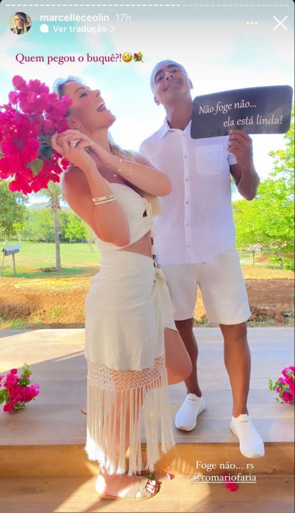 Romário, de 56 anos, e a sua nova namorada, Marcelle Ceolin, de 31, foram padrinhos de um casamento que aconteceu em Fernando de Noronha. Nos Stories do Instagram, a influenciadora digital publicou que pegou o buquê da noiva.