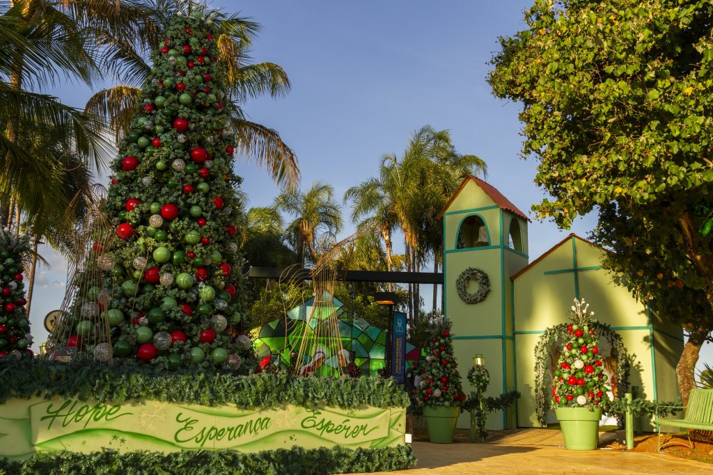 O verde, o tom da “Esperança”, é a cor predominante na decoração. Iluminado, o pórtico de entrada dá boas-vindas ao “Natal de luz” do Pontão. As palmeiras e coqueiros da rua principal e da passarela da orla do complexo foram iluminadas por micro lâmpadas em tom verde. Uma árvore de 5 metros tem a sua base decorada com a palavra esperança escrita em 12 idiomas. A ela se somam outras seis de 1,80 metro que receberam bolas verdes, vermelhas, folhas de eucaliptos e lâmpadas. Destaque para uma igreja cenográfica em estilo colonial medindo 4×4 metros², com uma torre com 6, 5 metros de altura. Quatro esculturas de anjo aramados e iluminados, duas posicionadas na árvore principal e duas no presépio, se destacam na decoração, criação do cenógrafo Ricardo Azevedo e produzido pela equipe de artesãos e funcionários do Pontão.