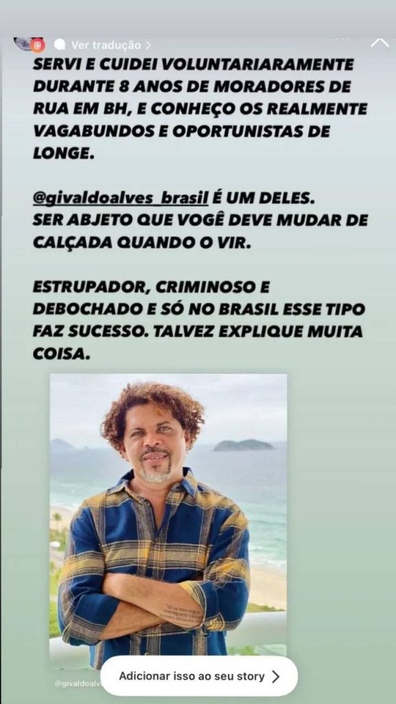 “Givaldo Alves é um deles. Ser abjeto que você deve mudar de calçada quando o vir. Estuprador, criminoso e debochado e só no Brasil esse tipo faz sucesso. Talvez explique muita coisa”, completou.