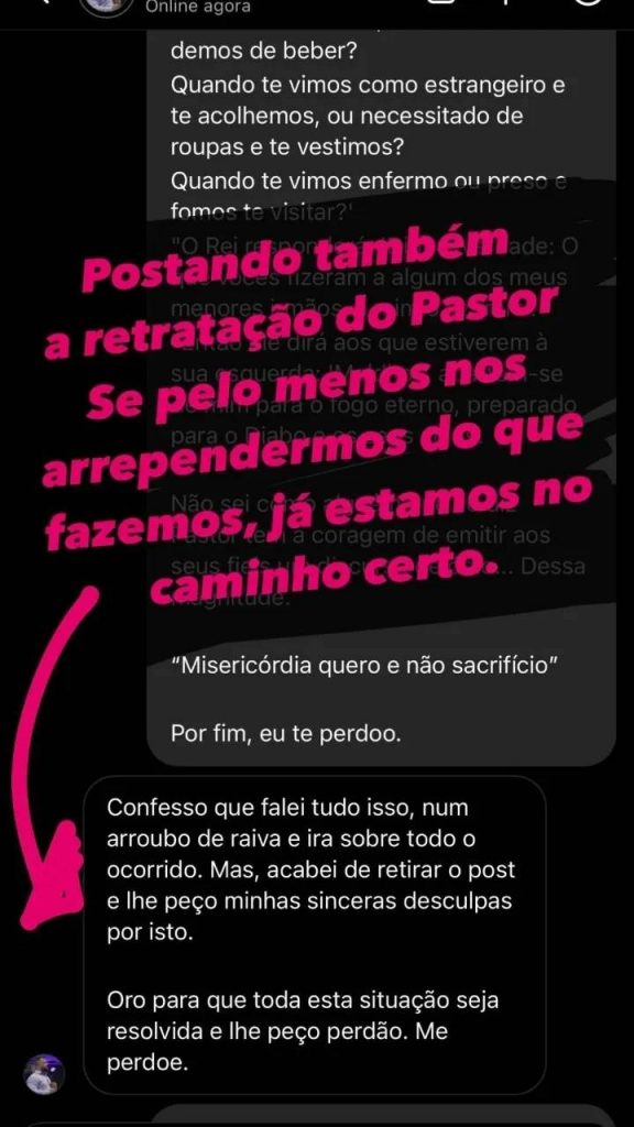 “Confesso que falei tudo isso, num arroubo de raiva e ira sobre todo o ocorrido. Mas acabei de retirar o post e lhe peço minhas sinceras desculpas. Oro para que toda esta situação seja resolvida e lhe peço perdão. Me perdoe”, escreveu.