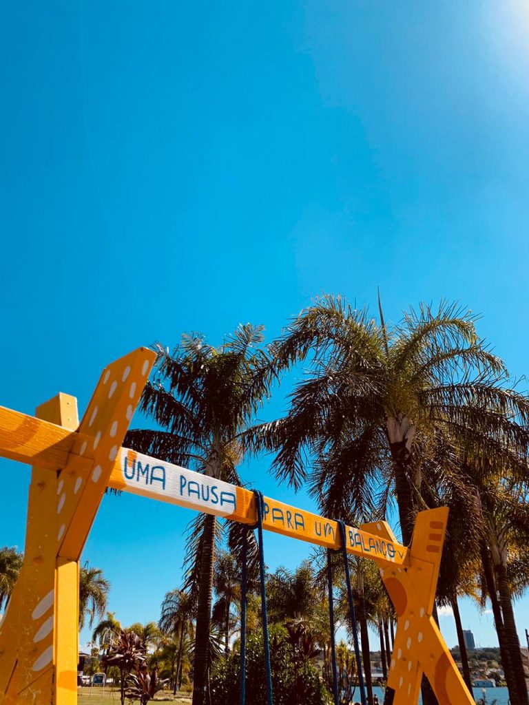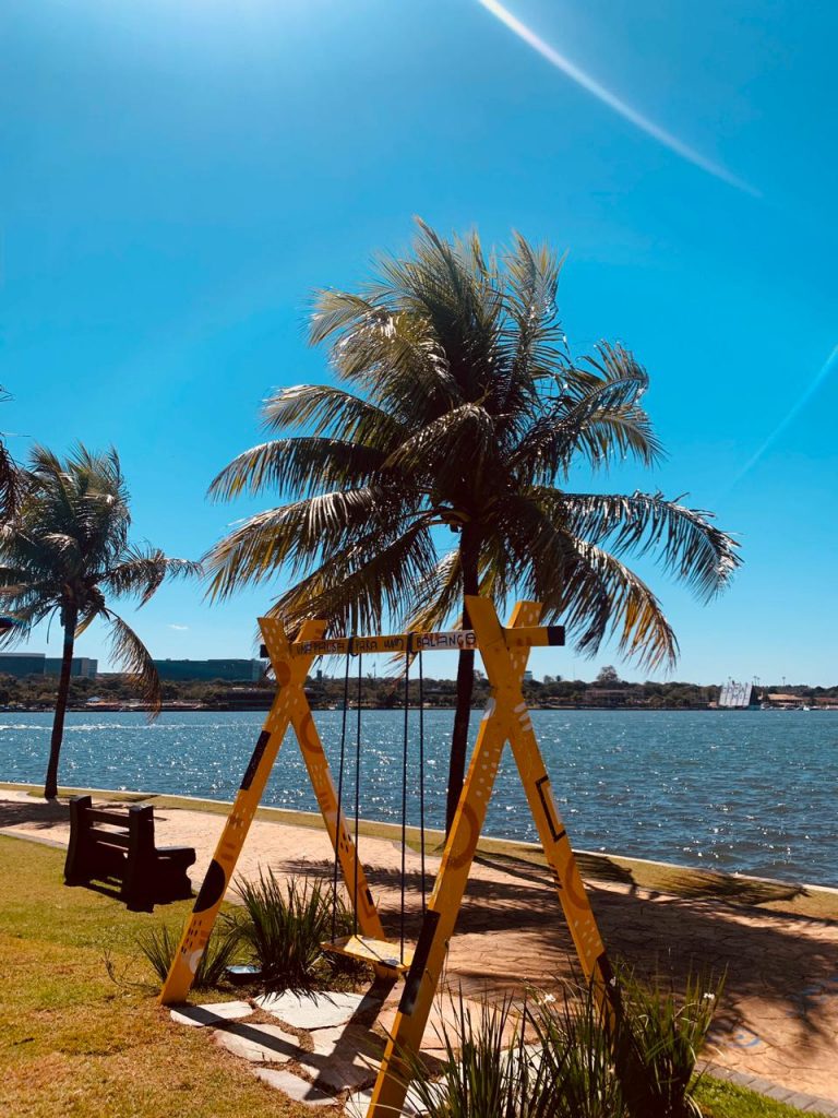 O céu inigualável de Brasília e uma das mais belas vistas do Lago Paranoá são o cenário do photo point com balanço, novidade do Pontão para os seus visitantes a partir deste mês de maio. Sucesso em vários países, o novo espaço instagramável do complexo de gastronomia e entretenimento do Lago Sul já está aberto ao público e traz a frase “Uma pausa para o balanço” e as cores azul e amarelo, em um trabalho gráfico da designer gráfica, Sammy Medeiros.