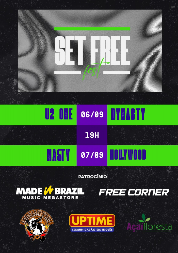 Nada melhor do que cantar a liberdade na data da independência do país, sobretudo em meio à essa pandemia que nos faz repensar e nos reinventar. É isto que quatro emblemáticas bandas brasilienses de rock vão fazer nos dias 06 e 07 de setembro, em formato LIVE, através do youtube a partir das 19 horas. No domingo, 06/09, vai acontecer a apresentação das bandas Dynasty e U2one e no feriado, 07/09, será a vez das bandas Nasty e Hollywood. Batizado de SET FREE, expressão em inglês que significa libertar, o mini festival traz shows envolventes com músicos de qualidade excepcional e repertório de muito bom gosto trazendo canções que o público canta junto e se emociona.
