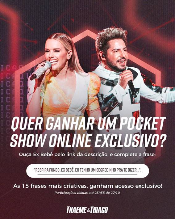 Enquanto os shows não voltam, Thaeme e Thiago estão promovendo um concurso cultural, no qual os ganhadores terão acesso a um show online exclusivo. Para concorrer, os participantes devem responder a frase: “Respira fundo, ex bebê, eu tenho um segredinho pra te dizer…”. As 15 frases mais criativas serão selecionadas. Para saber mais sobre as regras do concurso acesse https://www.universalmusic.