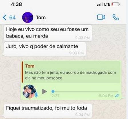 “No dia 4 de outubro, depois de a gente se falar por vários motivos e assuntos, o Tom me abordou meio diferente e falou que nunca tinha me falado o motivo da separação dele dessa moça. Aí, ele me mandou as fotos da agressão e a partir dali os áudios. Disse que tinha muita vergonha, que estava se sentindo um lixo, se sentindo mal, à base de calmantes, com muita vergonha. Ele me contou, está nos áudios, que foi agredido depois de uma briga boba”, revela Alessandra ao jornal Extra.