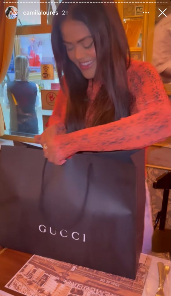 Além do anel de ouro de Virgínia e Zé Felipe, Camila Loures também ganhou de presente uma bolsa Louis Vuitton no valor de R$ 12.300. O mimo foi dado por seu irmão, Phillipe Loures. A amiga da youtuber mineira, Clarissa Delpupo, também presenteou Camila com uma bolsa da Gucci.
