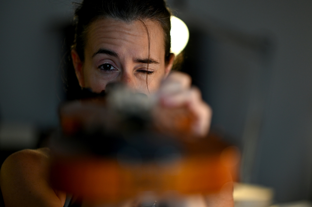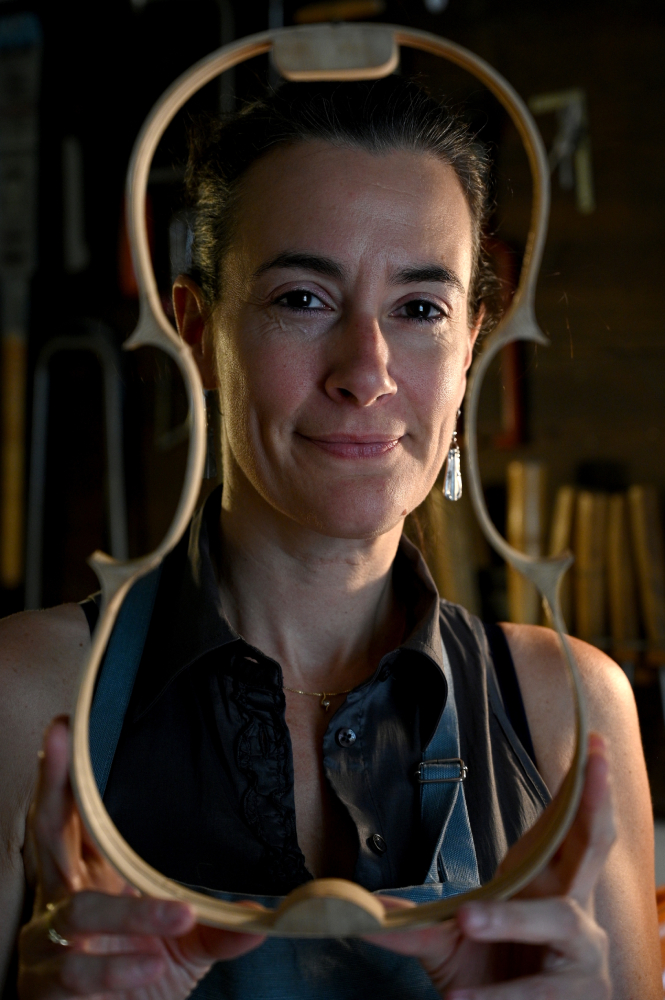 Goivas, tesouras, navalhas, serras e pequenas escovas de madeira se empilham sobre sua mesa de trabalho. Meticulosamente, ela põe o braço no corpo de um violino encomendado por um músico antes de aplicar o verniz e montar o resto.