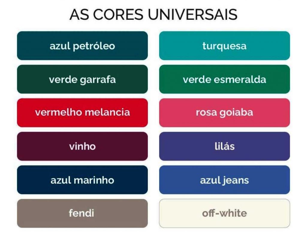 Para quem ainda não teve a oportunidade de fazer a análise de coloração pessoal uma alternativa é usar as cores universais, que são aquelas que harmonizam com as peles da maioria das pessoas.