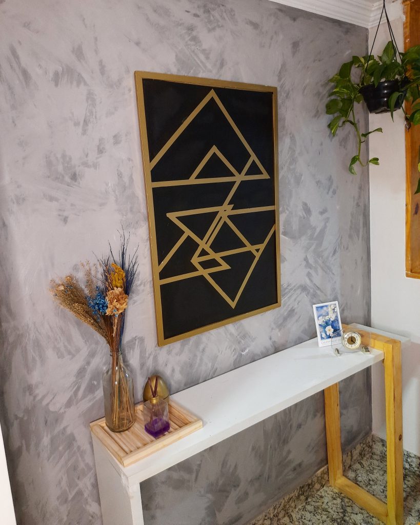Chegando na parte da decoração eu vi um aparador lindo na intermet, mas estava tão caro, foi aí que meu marido achou uma porta que ia ser descartada no serviço dele, sim gente ia pro lixo, desmontamos a porta pegamos uma madeira que sobrou da obra aqui casa, cortamos parafusamos e pronto tínhamos uma aparador lindo e sofisticado, os outros detalhes foram fluindo, peguei um quadro velho e pintei, fiz um arranjo com folhas secas, e quando vi nossa sala de jantar já estava pronta, usamos a criatividade, e confesso que foi além do que imaginávamos, demorou mas enfim conseguimos.