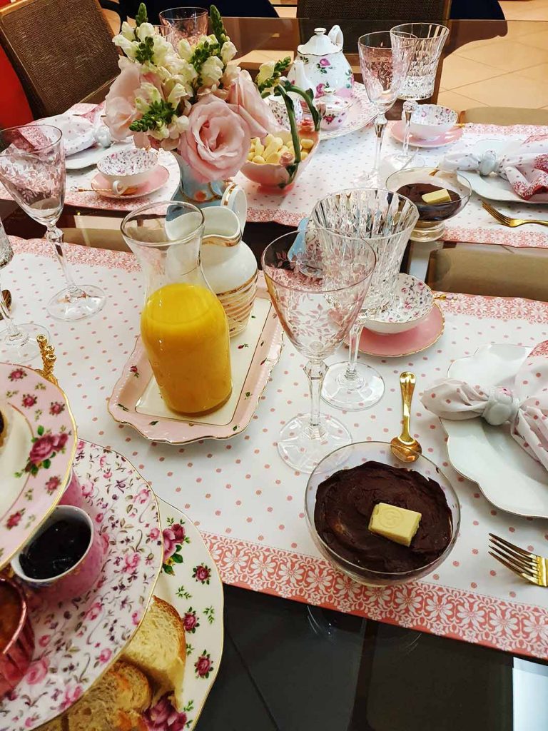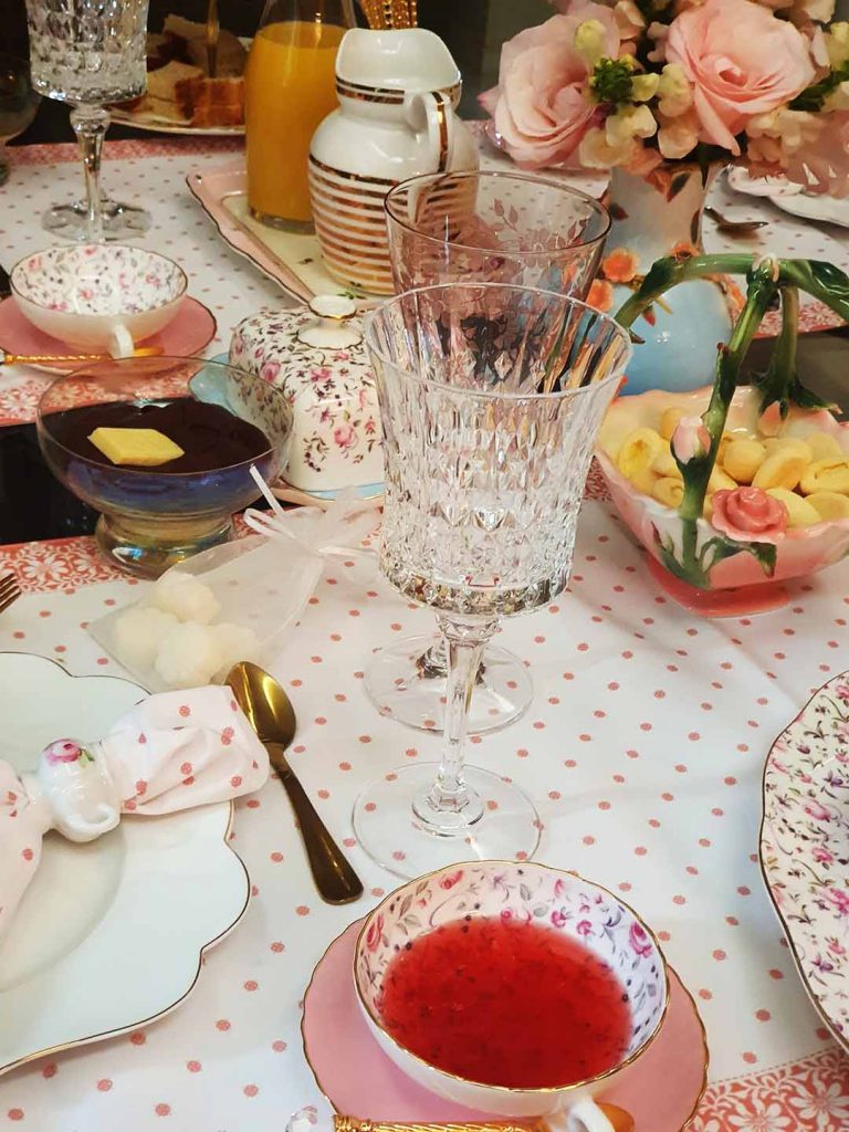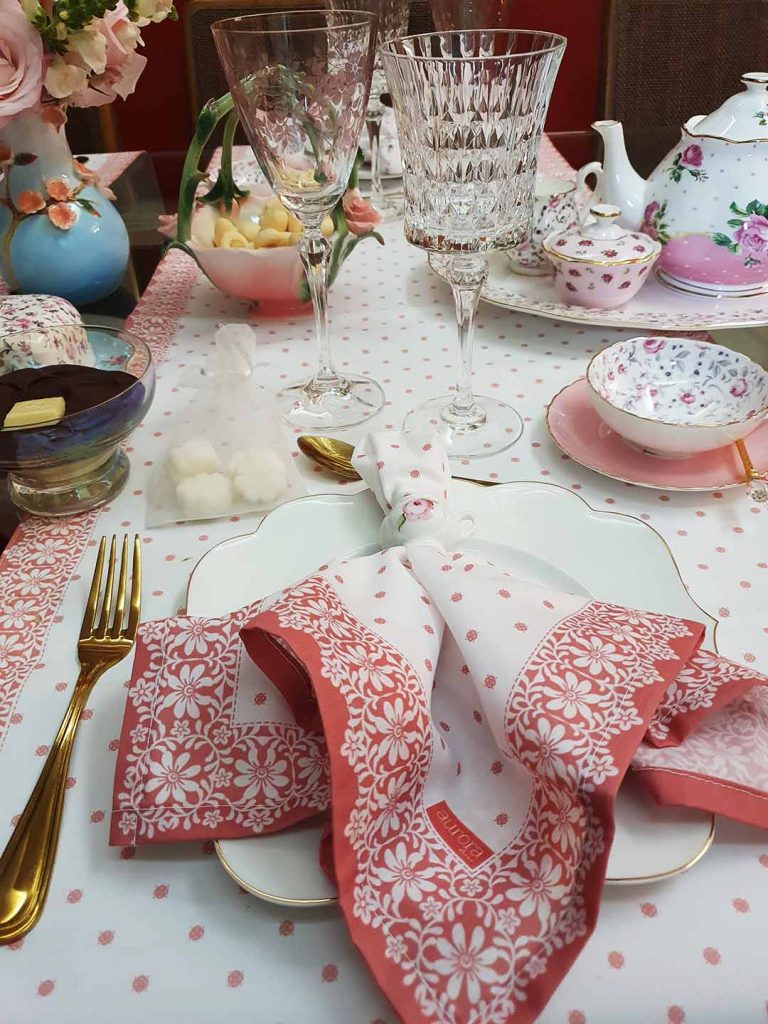 Fiquei muito feliz com o convite e a sugestão de fazer mesa de chá porque está nas minhas memórias afetivas. Minha mãe gostava muito de chá e fazia mesas diárias para receber suas amigas vizinhas. Cresci vendo minha mãe arrumando mesas com toalhas e as louças que tinha e aprendi com ela. Sou meseira por amor. Hoje, a mesa de chá ganhou mais elegância e sofisticação (shabby chic) com flores, cores claras e uma variedade de louças. Podemos usar toalhas, trilhos, jogos-americanos, basta seguir a etiqueta e a criatividade em sua composição. Coloque xícaras à direita do prato de sobremesa, taças para água e suco e até espumante, se quiser. O suporte para doces e salgados também ganha destaque e ajuda a compor a mesa. Pode servir sanduíches, tortinhas, sequilhos, cupcakes, macarrones, docinhos e geleias. A minha sugestão é fazer torrões de açúcar que dão um charme à mesa.