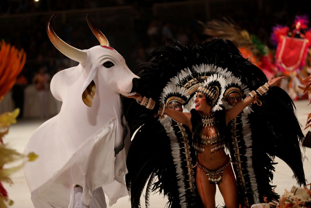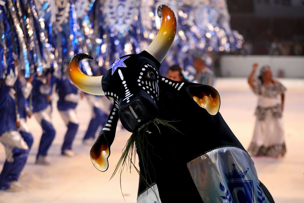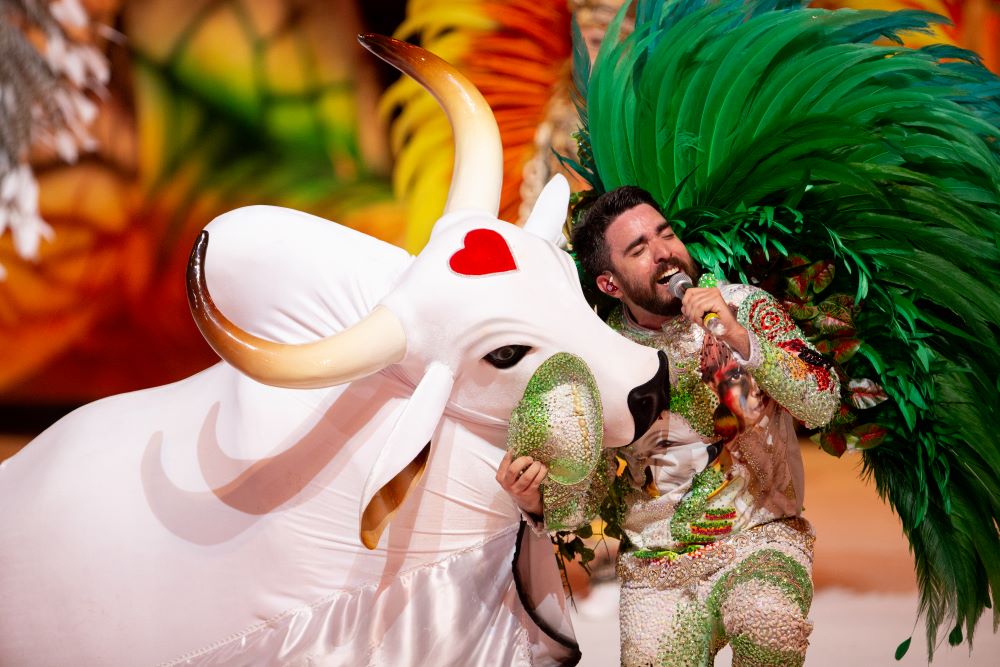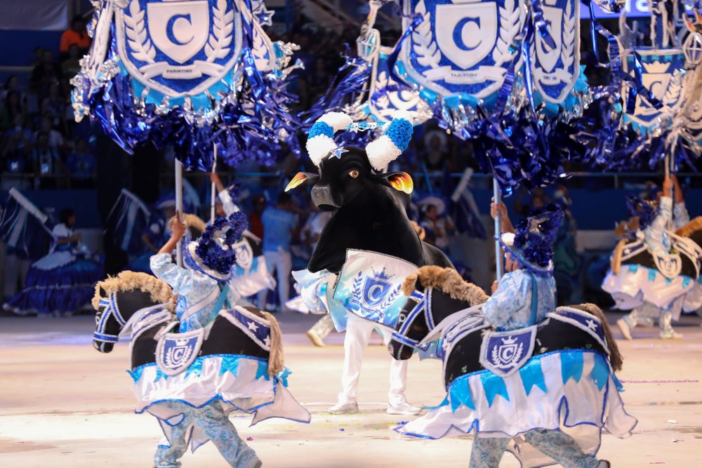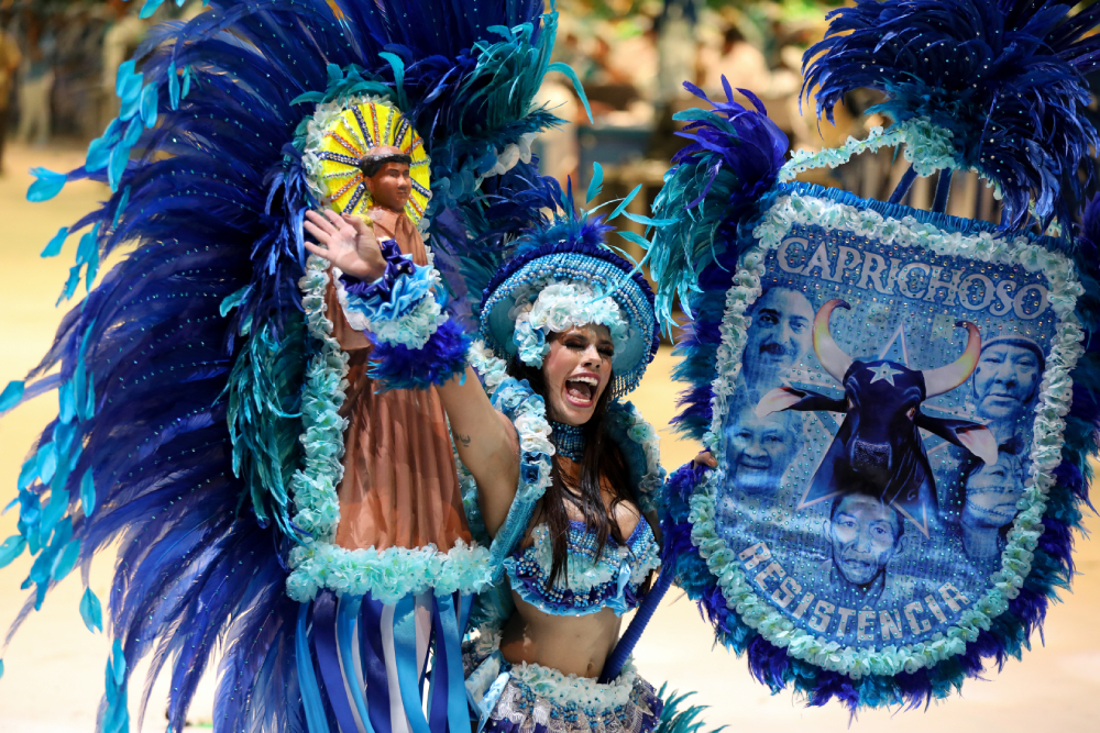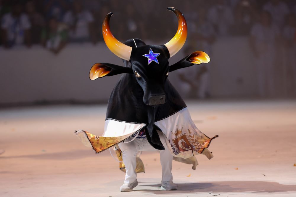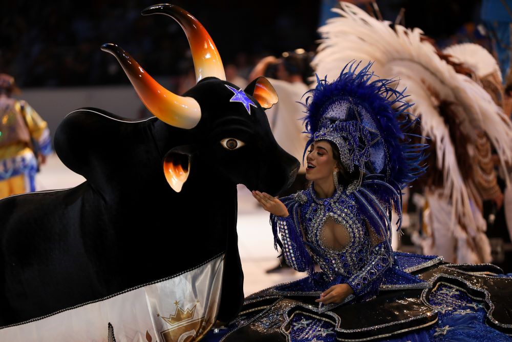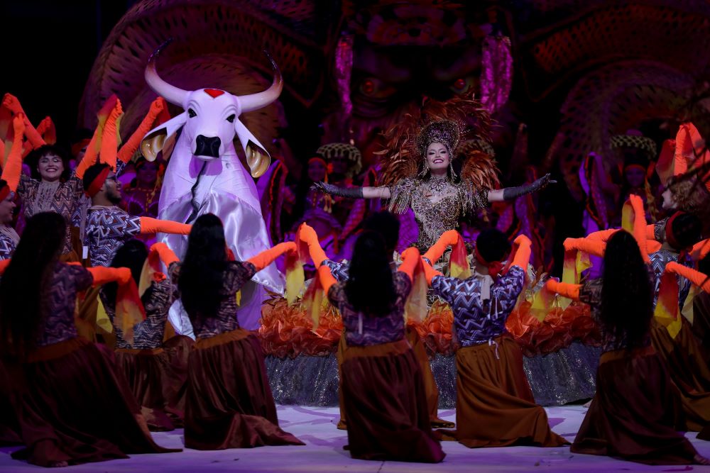 De acordo com a tradição que remonta a cerca de cem anos, dois grupos disputaram o título representando o boi-bumbá: de um lado está o “Garantido”, simbolizado pela cor vermelha; do outro, o “Caprichoso”, de azul. As apresentações giraram em torno de uma lenda local sobre um boi ressuscitado: os vermelhos trazem um boi branco, e os azuis, um boi preto.