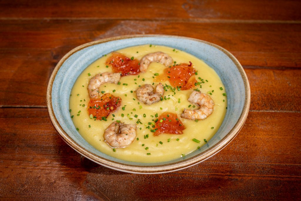 Caldo de baroa com camarões e geléia de pimenta. Foto: Produtora Ktdral/Divulgação