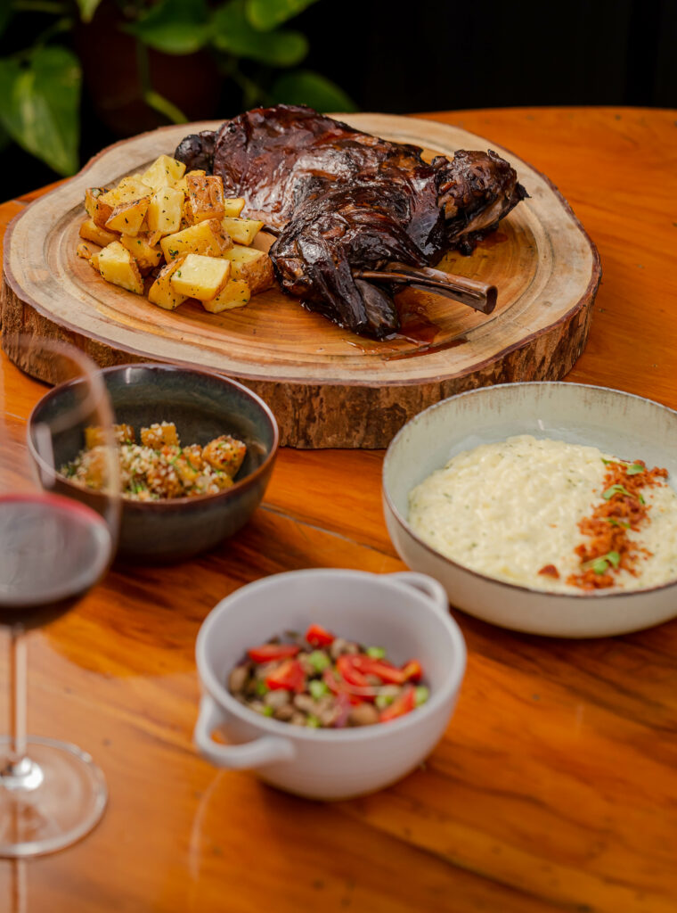 As opções são Costelinha suína assada na brasa ao molho barbecue de goiaba (R$ 172) e Paleta de cordeiro assada lentamente na brasa (R$ 220). Ambas são servidas com guarnições de arroz cremoso, farofa de banana da terra, salada de feijão verde e batata rústica.