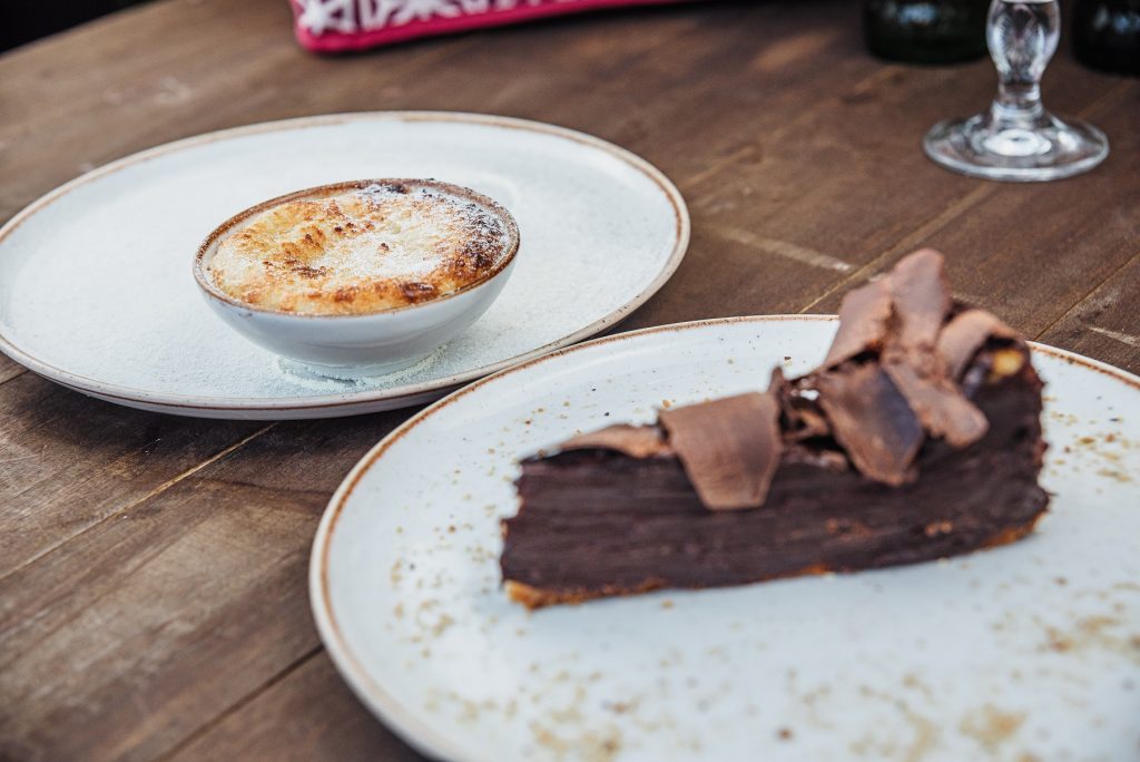 ? Bacallá Confit – bacalhau ao molho de manteiga noisette com amêndoas. Acompanha de purê de três batatas e brócolis ao alho;