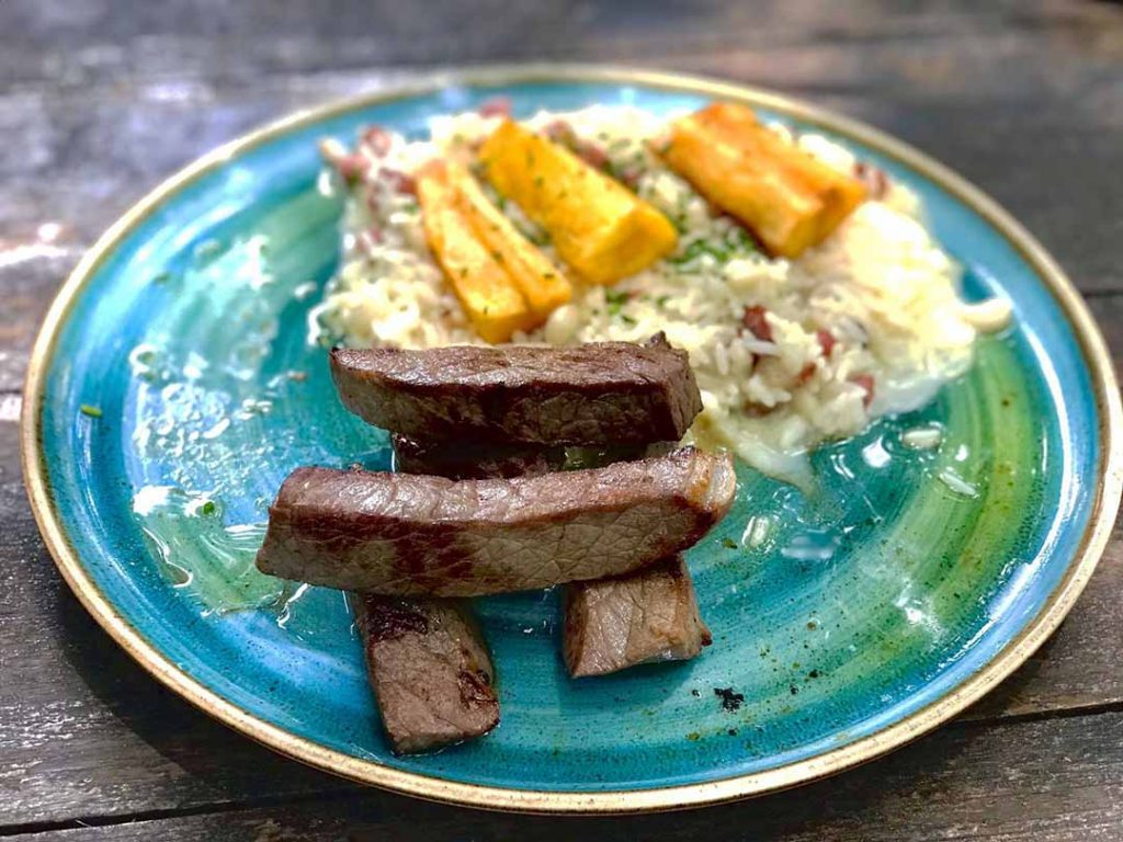 Carne de sol grelhada na manteiga de garrafa, baião de dois cremoso e mandioca frita. - Salmone Nippon (SG) (SL)