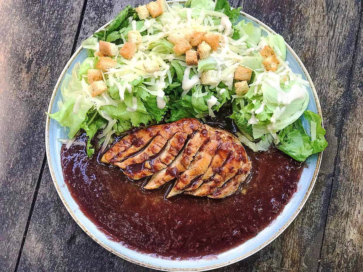 Pollo Frutti di Bosco – leque de frango ao molho de frutas vermelhas com salada da casa.