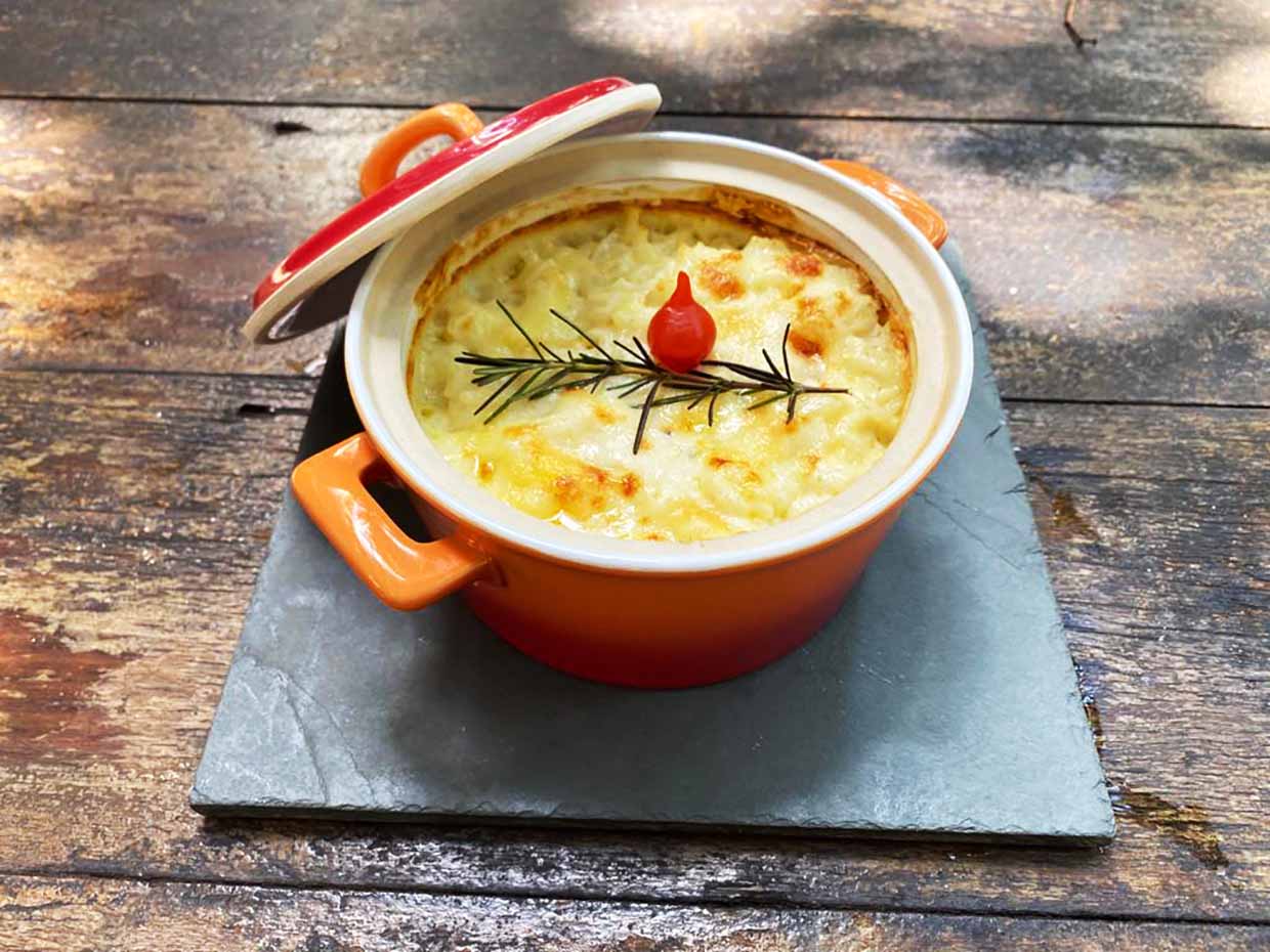 Gratin de Bacalhau – Bacalhau desfiado gratinado com creme de mandioca em cama de arroz branco, cebola caramelizada e ciboulette.