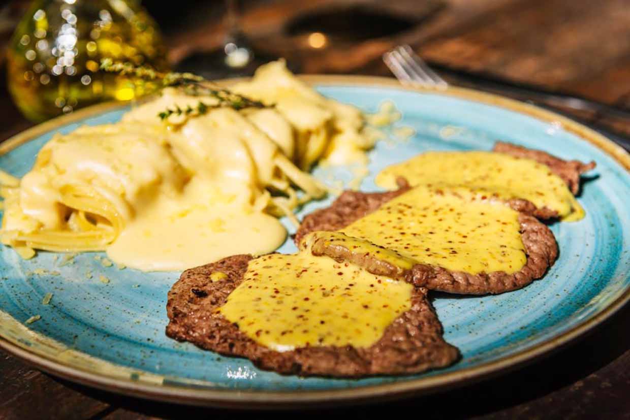 Paillard alla Mostarde – paillard de contra-file ao molho 3 mostardas com espaguete Alfredo. Foto Juliano Azevedo