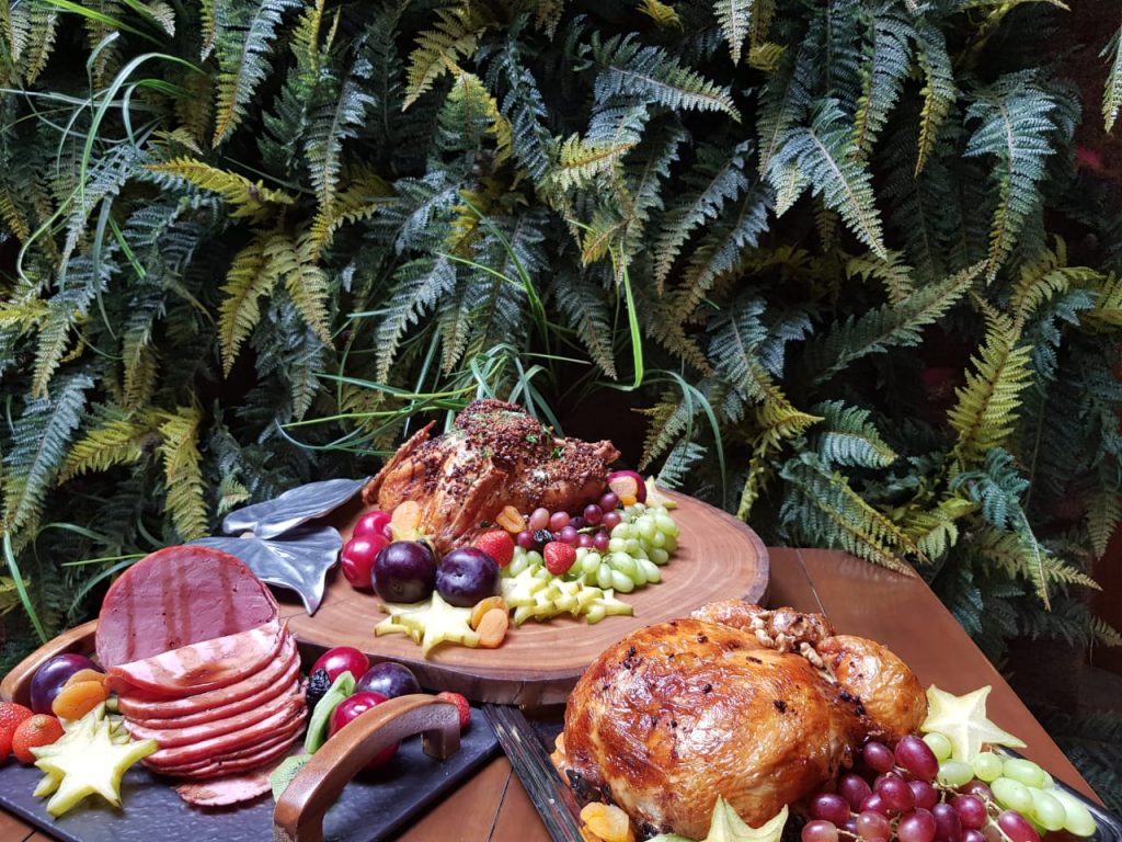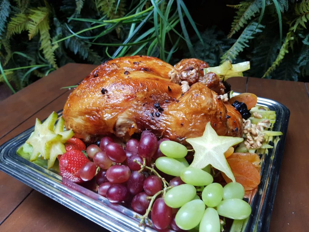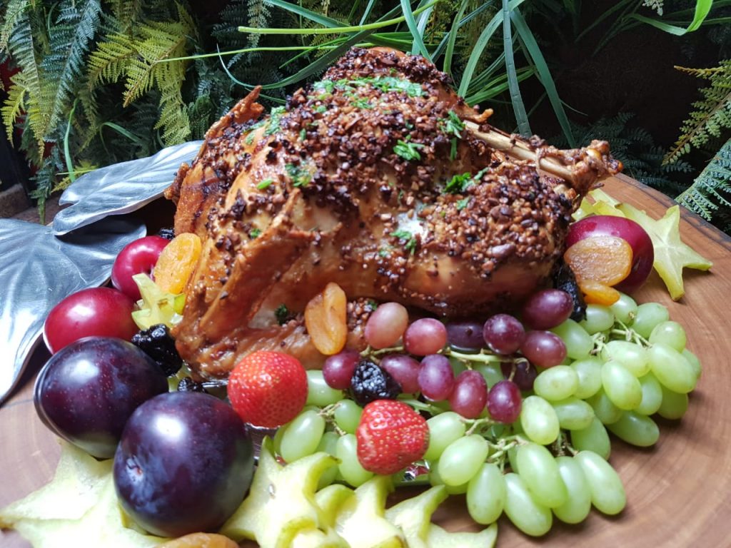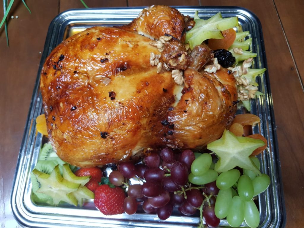 – Peru desossado e recheado com quinoa e frutas secas. Ladeado e decorado com frutas natalinas e farofa