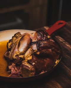 - Cupim cozido por 72h, purê de batatas peruanas com alho negro e cebola caramelizada