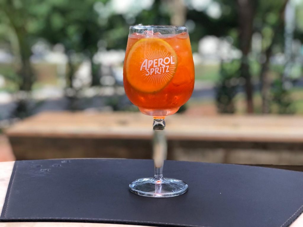 O primeiro é o tradicional Aperol Spritz (R$ 32), feito com aperol, espumante prosecco, água com gás, gelo e fatia de laranja. Para quem gosta de cocktails mais doces, o Apple Martini (R$ 30) é a sugestão. Feito com vodka, triple sec, licor de maçã e grenadine, a bebida tem um sabor mais intenso.