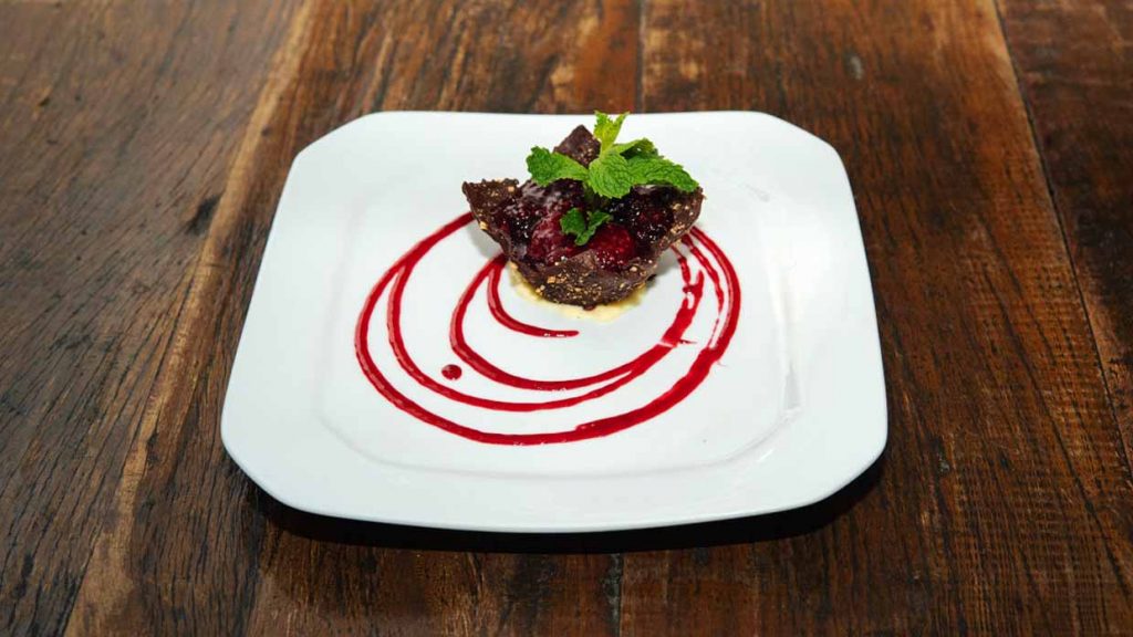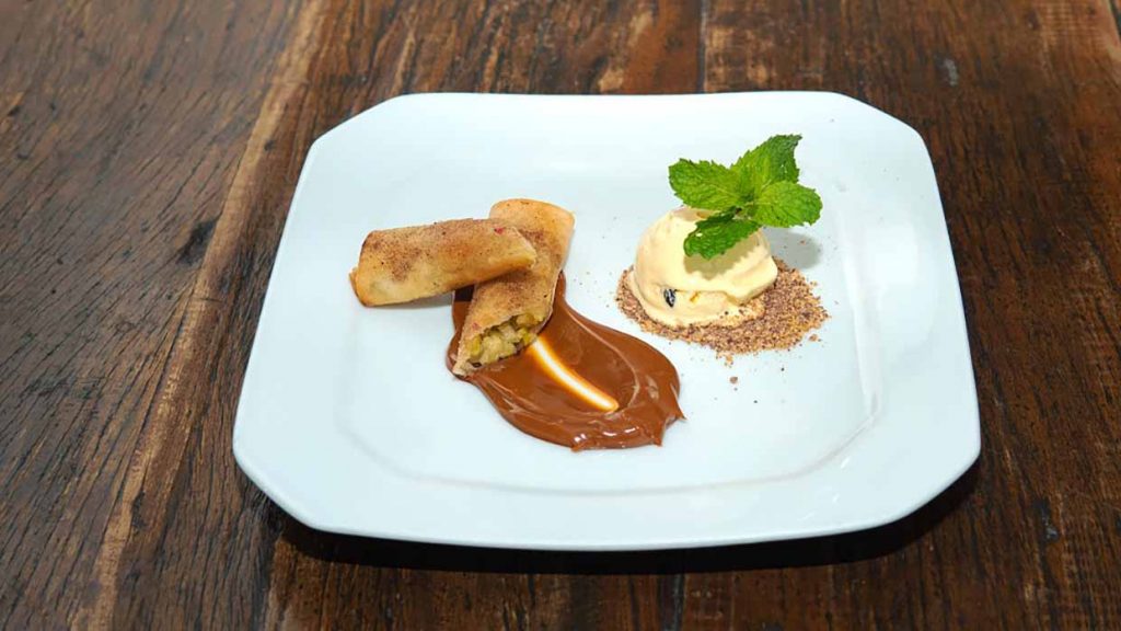 - Casquinha de Wantan: wantan assado lambuzado no creme de avelã com creme patisserie e calda de frutas vermelhas.