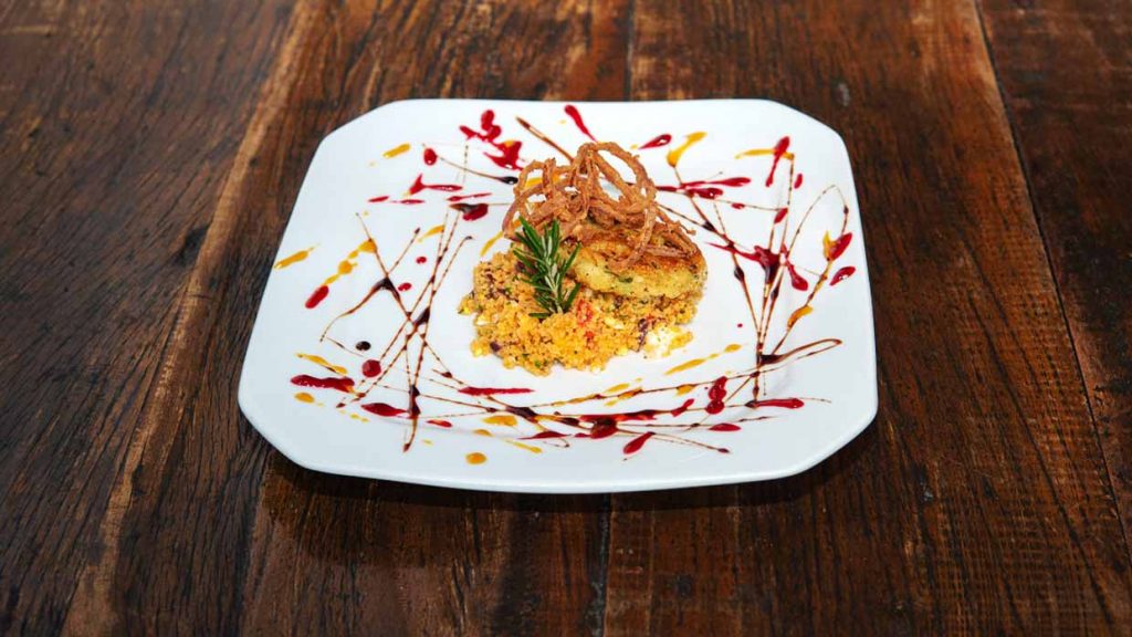 - Cuscuz marroquino português: cuscuz hidratado no caldo de peixe com pimentões confitados, tomate, azeitona e ovo ralado com hambúrguer de bacalhau com cebola crocante;