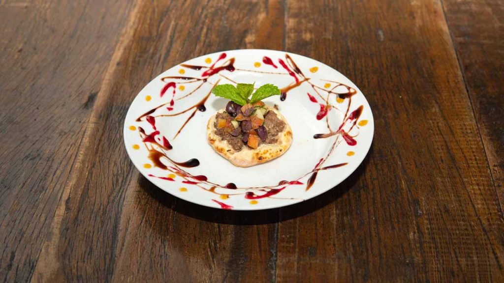 - Esfiha de autor: massa de pão sírio assada, com coalhada seca, carne moída temperada com zatar, cebola, limão, hortelã e salada de pepino, tomate, azeitona preta e orégano;