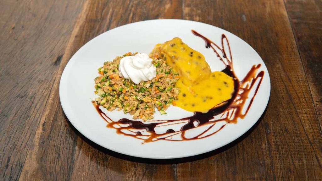 - Pescada amarela: pescada amarela ao molho de caipiroska de maracujá com arroz chinês com shoyu e espuma de gengibre;
