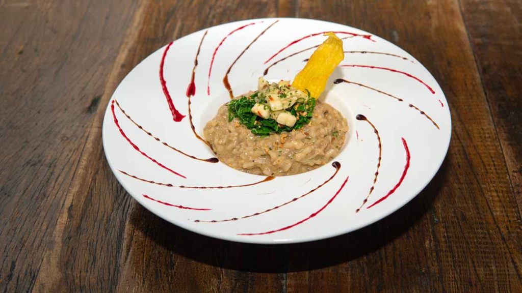- Risoto de costelinha: risoto de costelinha de porco ao molho do assado com couve refogada no alho crocante e tartare de banana.