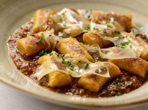 - Prato Gnocchi Doratti Con Ragù Di Agnello e Fonduta Parmeggiano – Gnocchi frito na panela com ragu de cordeiro e creme de parmesão (R$ 66,00) – do restaurante A’mano