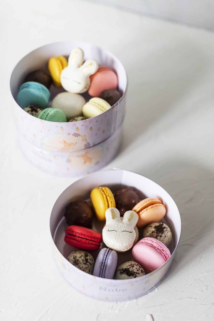 Entre as opções de combinados e louças de porcelana: Copinho P, composto por um copo de porcelana com estampa exclusiva recheado com 12 meio ovinhos de chocolate sortidos .(7,5 cm x 6,5 cm – R$60); Copinho M, composto por copo de porcelana com estampa exclusiva recheado de bolo de cenoura e brigadeiro, finalizado com macarons (10cm x 7cm – R$70); Caixa sortida, feita em acetato com estampa exclusiva, acompanhada de 6 macarons tradicionais, 5 trufas e um macaron de coelho (R$60); Porcelanas exclusivas, pintadas à mão pela artista plástica @ro_porcelanas, sendo duas opções. A primeira é um ovo liso de porcelana recheado com 15 macarons (R$290) e o segundo, ovo relevo com coelho de porcelana recheado com 12 macarons (R$320).