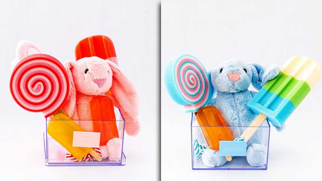 Já pensou em ensaboar o corpo com um picolé? O kit Páscoa Splash é composto por uma esponja em formato de pirulito e por um sabonete e uma esponja em formato de picolé, além de um coelhinho de pelúcia super fofo. O kit está disponível nas cores azul e rosa e saem por R$189,00 cada.
