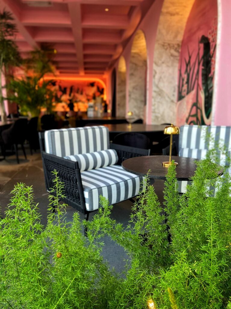 Seguindo com nossa visita conjunta ao New by Dudu Camargo na CasaCor, é impossível não destacar o impacto visual que o ambiente desenhado pelos arquitetos Orestes Blanco e Rosa Maranini causa ao olhar. Com portas de vidro, pontos de luz estrategicamente posicionados e uma explosão de rosa-salmão, atingindo seu ápice em um grande painel que grita “Miami encontra o Caribe”, o espaço convida você a mergulhar na experiência já a partir da fachada. Tudo isso, é claro, foi pensado para combinar com a personalidade expansiva e sempre ligada no 220 de Camargo, que também se reflete no nome e nas descrições engraçadinhas dos pratos.