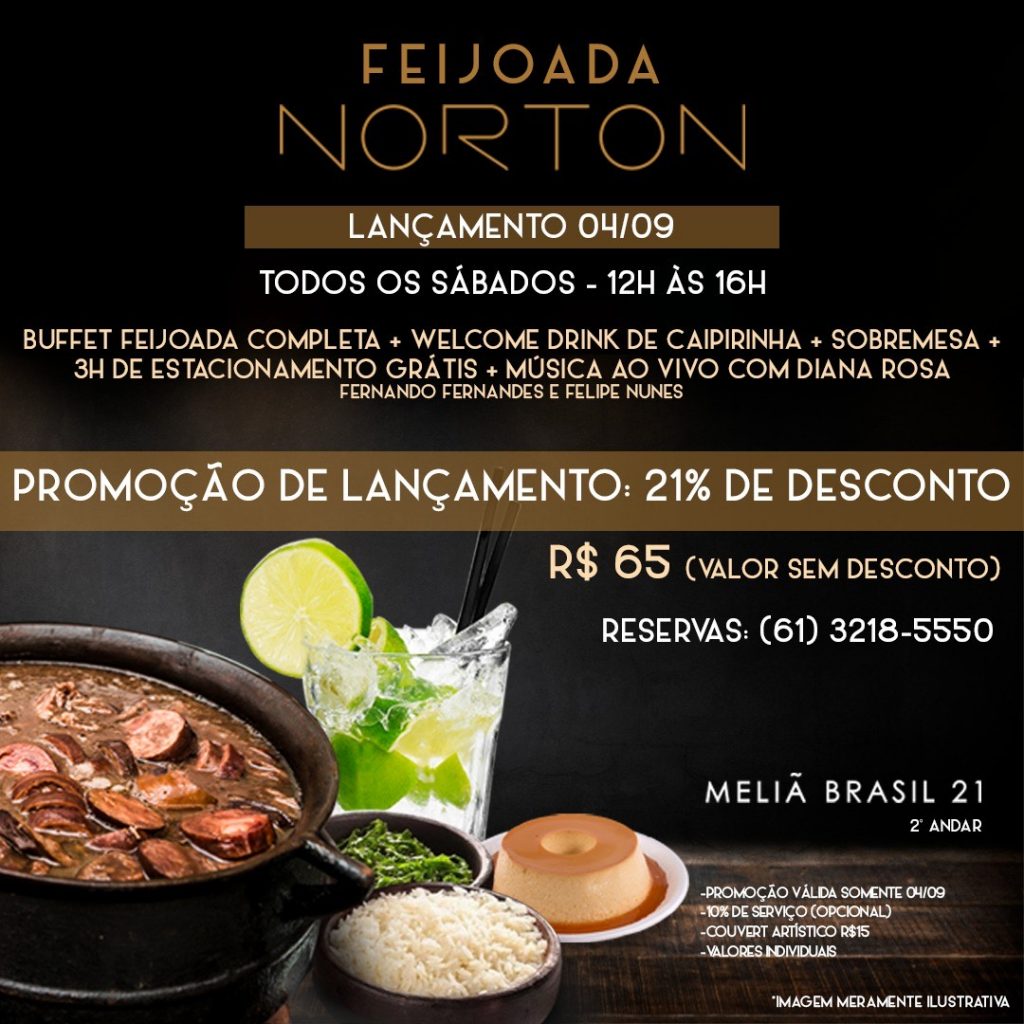 O Restaurante Norton, localizado no 2º andar (bloco D) do Brasil 21, está com uma novidade: é a feijoada aos sábados, com direito a welcome drink de caipirinha e atração musical com Diana Rosa (voz), Fernando Fernandes (violão) e Felipe Nunes (bandolim).